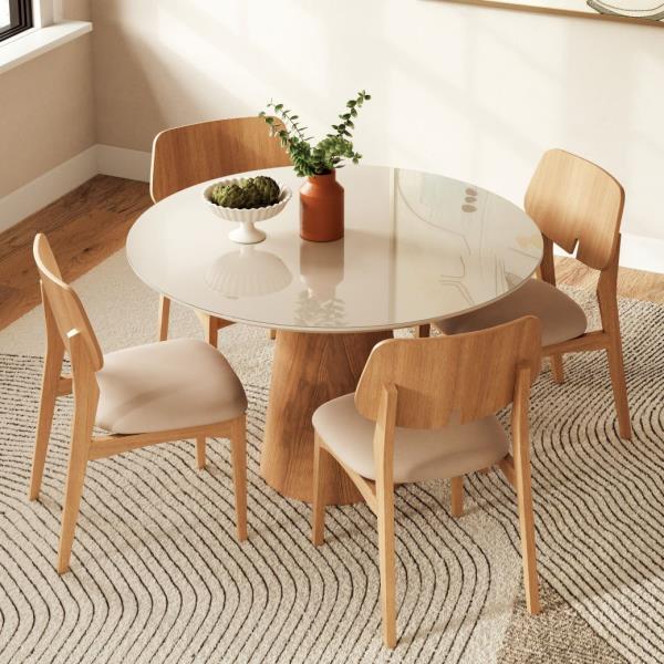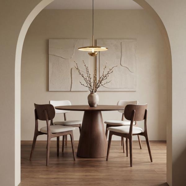 The Mona Glass Top Round Dining Table epitomizes modern elegance and expert craftsmanship. Featuring a captivating, lacquered glass round top with meticulous beveled edge detailing and supported by a corresponding conical pedestal base crafted from fine wood veneers, it stands as a masterpiece of design synergy.